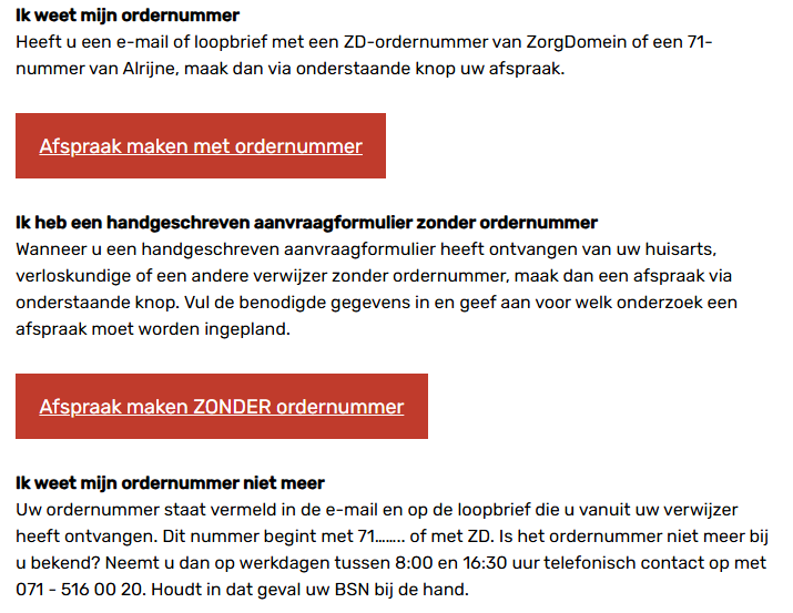 Iemand anders kan ook online een afspraak voor u maken als hij/zij een geldig e-mailadres heeft. Mocht dit niet mogelijk zijn, dan kunt u ook telefonisch een afspraak maken via 071 – 516 00 20. Houd er rekening mee dat de wachttijd aan de telefoon bij drukte lang kan zijn.